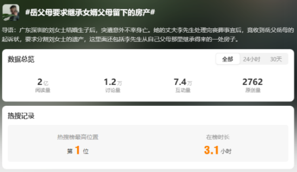 近日,深圳地区“岳父母要求继承女婿父母房产”的话题登上微博热搜,引起了网友们的广泛关注与热议。