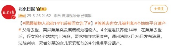 父母去世,离异弟弟突发疾病成为植物人,4个姐姐扶养他14年,在弟弟去世后,弟弟的女儿将4个姑姑告上法庭,要求独自继承遗产。北京通州法院3月26日发布消息,法院判决,死者刘某的女儿安安和他的4个姐姐平分遗产