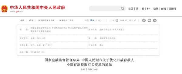 2024年4月26日,金融监管总局、中国人民银行联合印发了《关于优化已故存款人小额存款提取有关要求的通知》(以下简称《通知》)。