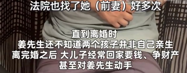 离完婚之后,大儿子经常回家要钱、争财产,对姜先生动手,后续姜先生做了亲子鉴定才发现孩子不是自己亲生的。