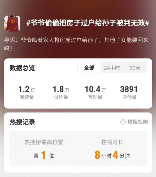 近日,#爷爷偷偷把房子过户给孙子被判无效#的话题冲上热搜榜第一,引发网友激烈争论。