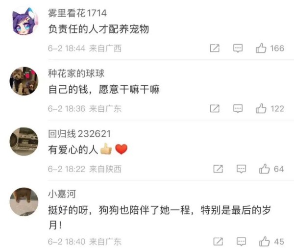 作为资深爱狗人士,她家中饲养4只宠物犬,且长期资助流浪动物保护事业,因此特意从存款中划出专项份额,委托儿子作为遗产管理人,负责“毛孩子”们后续的生活照料与相关费用支出。