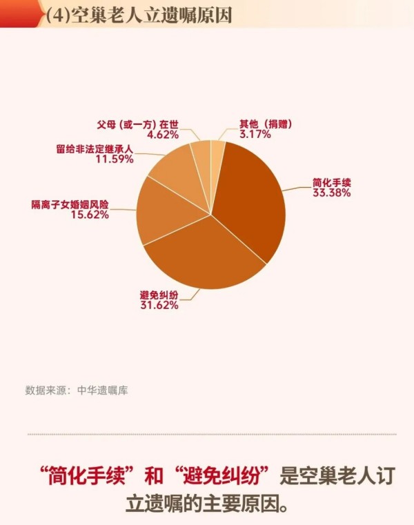 “没有遗嘱的家庭,往往容易陷入更复杂的法律泥潭。”中华遗嘱库创办人陈凯说道。在中华遗嘱库十二年来接待的空巢老人中,33.38%直言立遗嘱是为“简化继承程序”,31.62%为“避免家庭纠纷”,更有11.59%打破传统将财产赠与孙辈等非法定继承人。