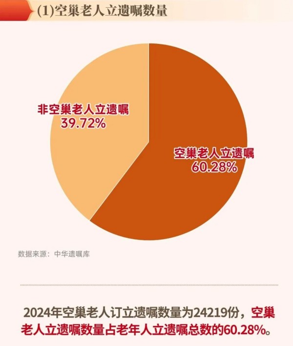 据《中华遗嘱库白皮书》(2024年度)数据统计,全国60岁以上老年人的遗嘱登记总数达到了40176份,其中空巢老人占比为60.28%,相当于每10份遗嘱就有6份来自子女不在身边的老人。