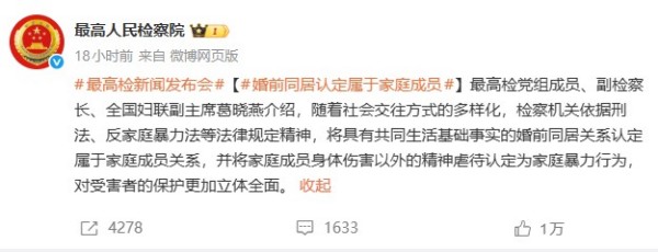 20251125日国际反家暴日,最高检在新闻发布会上明确将具有共同生活事实的婚前同居关系认定为家庭成员,并将精神虐待纳入家庭暴力范畴。