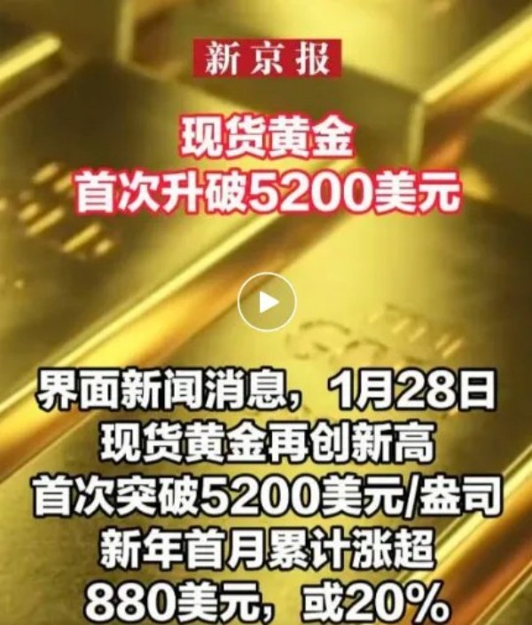 2026年开年不到一个月,国内主流金店足金报价从1月1日的1357元/克,飙升至1月28日的1618元/克,二十多天涨了261元,单克最高甚至突破1620元,而国际金价更是突破了5200美元/盎司的历史新高。