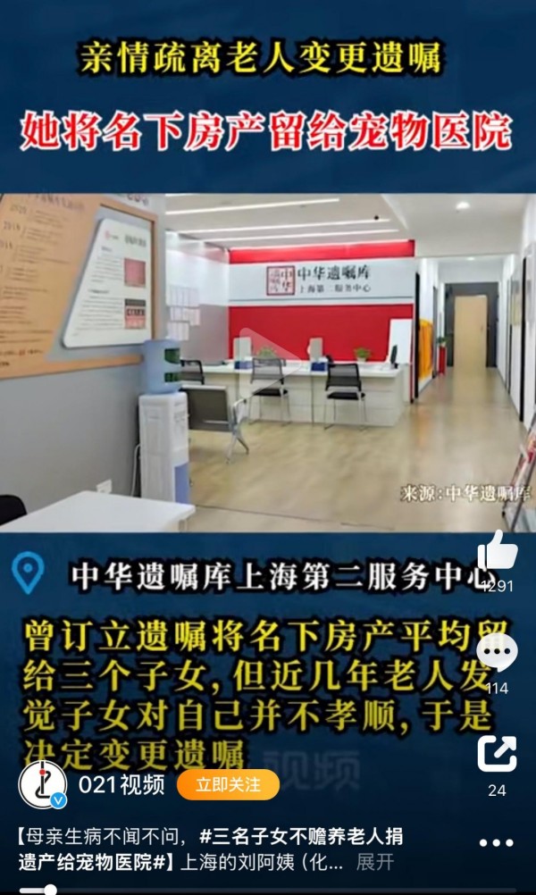 刘阿姨独居多年,三名子女从未尽到赡养义务,常年只有宠物陪伴左右。刘阿姨立下遗嘱将名下全部房产捐赠给了宠物医院,希望宠物医院在自己百年之后照顾好自己的宠物。