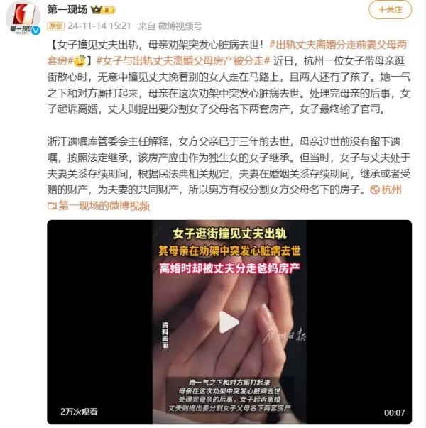 近日,杭州一位女子带母亲逛街散心时,无意中撞见丈夫挽着别的女人走在马路上,且两人还有了孩子。她一气之下和对方厮打起来,母亲在劝架中突发心脏病去世。处理完母亲的后事,女子起诉离婚,丈夫则提出要分割女子父母名下两套房产,二人争执不下诉至法院,女子最终输了官司,被分走一半父母房产。
