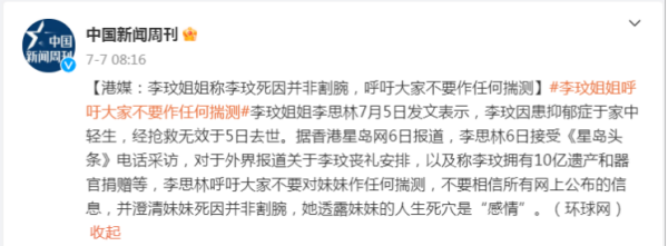 7月7日08:16,时隔两日后,李思林接受媒体采访澄清,李玟死因并非外界描述的自杀离世。