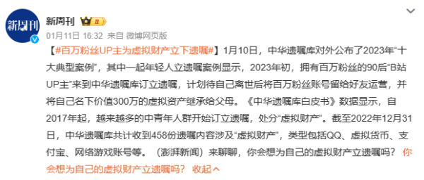 然而,当虚拟世界的财富与现实世界的法律交织在一起时,会发生什么呢?不久前,一则百万粉丝up主立遗嘱传承账号的消息引发轩然大波,让无数网友开始思考:当我们在虚拟世界中的财富积累到一定程度时,这些数字资产该何去何从?