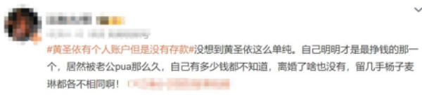 黄圣依的财务状况引发了网友的激烈讨论,不少网友们认为,作为一名知名艺人,黄圣依在经济上却高度依赖丈夫杨子,甚至对自己的财务状况毫不知情,这种情况令人担忧。