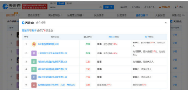 天眼查App显示,黄圣依名下共关联6家企业,其中3家为存续状态;杨子名下共关联15家企业,其中7家为存续状态。两人共同关联的企业有6家,仅巨力影视传媒有限公司、上海四海天地文化发展有限公司2家为存续状态。知识产权信息显示,巨力影视传媒有限公司曾申请注册多枚“黄圣依”“杨子”商标,国际分类涉及广告销售、教育娱乐等,当前商标状态多为已注册。