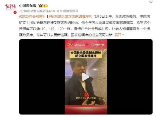 36日,全国政协委员、中国煤矿文工团团长@靳东在接受采访时表示,他今年向大会建议成立国家遗嘱库,消息一出,便迅速登上热搜第二名。