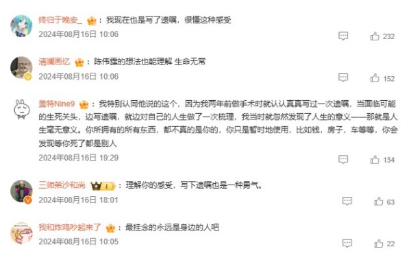 网友们对此议论纷纷:“陈伟霆这是要成为‘心灵导师’的节奏啊!遗嘱都能写得这么有爱,不愧是我们的偶像!”
