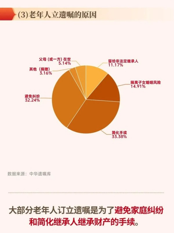 中华遗嘱库白皮书数据显示:大部分人群订立遗嘱的原因是为了避免纠纷和简化手续,比例分别为32.24%和 33.38%;其次,隔离子女婚姻风险的比例仍然不在少数,比例达14.91%;将财产留给非法定继承人比例达11.17%,非法定继承人多指孙辈。这些数据显示了老年人对财富传承规划的日益重视,同时也反映出现代家庭关系的复杂性和多元性,使得遗嘱在财富传承中显得更加重要。