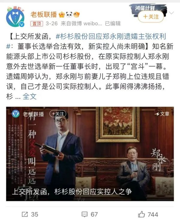 杉杉股份400亿遗产“夺权”大战跌宕起伏,经过了一个多星期的发酵,已经在各大网络社交平台引起网友的广泛关注,一度冲上微博热搜。杉杉股份主体公司于328日进行多项信息变更,包括法定代表人、章程备案和注册资本(金)变更等,其中法定代表人由郑永刚变为郑驹。就杉杉股份的最新进展,笔者采访了中华遗嘱库管委会主任陈凯。