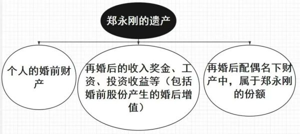 从上表可以看出,即使在郑永刚名下的财产,也可能有现任配偶的份额。这部分不属于遗产。有的人要问了:郑永刚的财产难道不都是和现任配偶再婚前的个人财产吗?毕竟公司是婚前成立的啊!