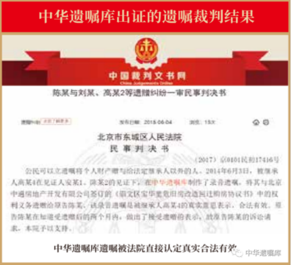 幸运的是,子女发现老人曾在中华遗嘱库订立过遗嘱,当法官拿出老人这份真实有效的遗嘱时,被告哑口无言,他称之为证据的自书遗嘱和录音遗嘱也被判为无效。