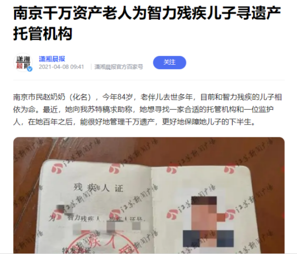 于是,她向媒体求助,想寻找一家托管机构和一位监护人,能在她百年之后管理近千万遗产,同时保障她儿子的下半生生活。