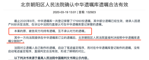 随后,北京朝阳区人民法院直接判决按照中华遗嘱库遗嘱分割财产。因前两份遗嘱均不符合法律规定的遗嘱形式要件,判定为无效遗嘱。